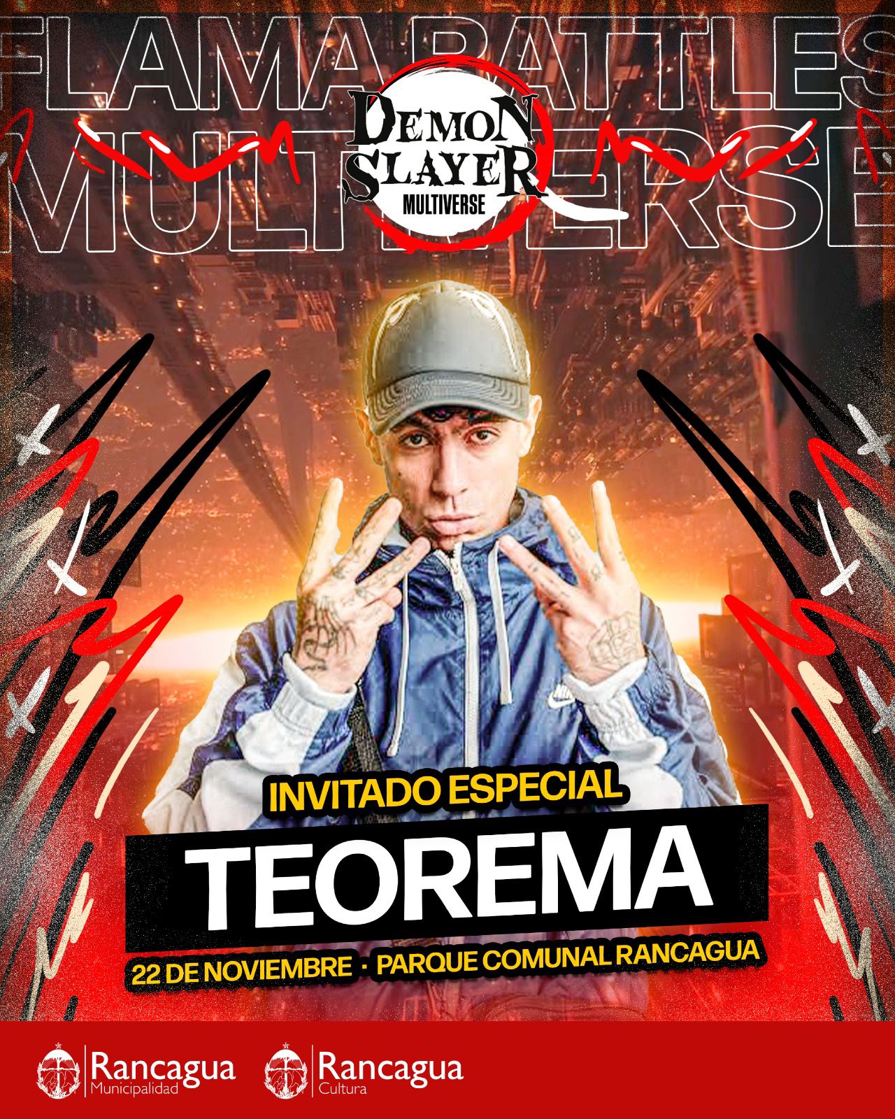 El Parque Comunal de Rancagua será el epicentro del freestyle este sábado 22 de noviembre con la realización del evento “Flama Battles: Demon Slayer Multiverse”, una jornada que reunirá a exponentes locales y nacionales de las batallas de rap improvisado. La actividad, que comenzará a las 16:00 horas, promete una experiencia llena de ritmo, talento y energía urbana.